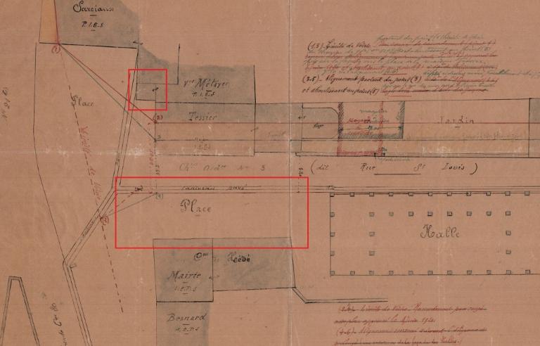 Sur le plan dressé d'après les anciennes réformations du domaine royal (vers 1680), il ne demeure déjà plus que trois porches. Le premier se trouvait à proximité de l'actuel n°10 place de la Mairie, le long de la rue Saint-Louis. Il apparaît encore sur le cadastre de 1829 mais plus sur un plan de 1922. Le second marque un angle entre deux bâtiments place du Parquet (entre les actuels n°2 et n°8 place de la Mairie). Sur poteaux de bois (Banéat : 182), il figure encore sur le cadastre avant d'être comblé et porte la mention "1 étage, bois, solide" sur le plan d'alignement de 1884. Ce pan de bois a disparu au 20e siècle. Le dernier se trouve au n°21 place de la Mairie : sous l’appellation « Pigeon Blanc » (Banéat : 183) et disparaît au début du 19e s., probablement en 1810 lors du remaniement de la partie maçonnée. Bien qu'il ait été démoli, une partie de ses pièces de bois a probablement été réutilisée pour la reconstruction du premier étage de cette maison.