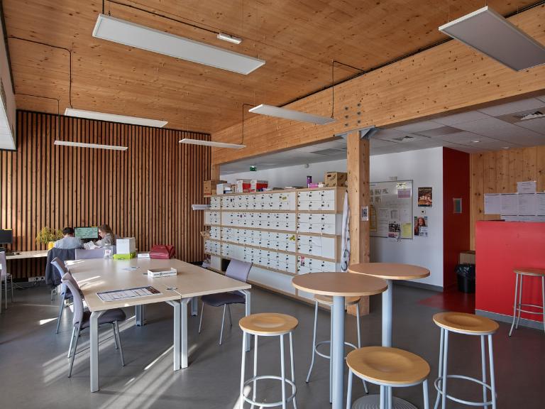 Sur le plan architectural, l'innovation est majeure : le bois est utilisé aussi bien pour les murs, la charpente que pour les planchers. Et même, première en Europe, pour la cage d'ascenseur. L'usage du béton est ainsi limité à la dalle du rez-de-chaussée.