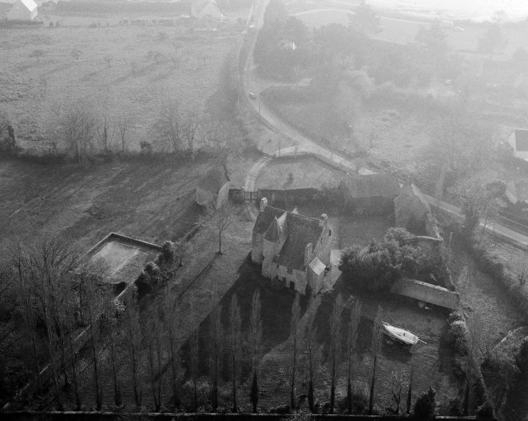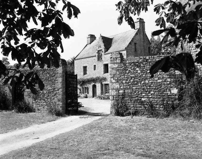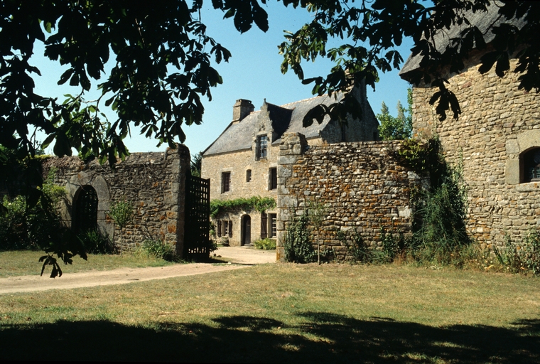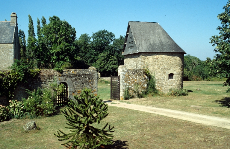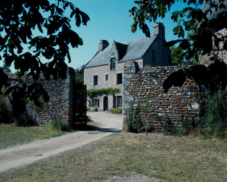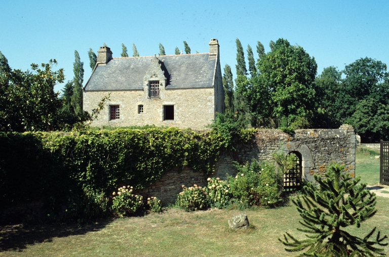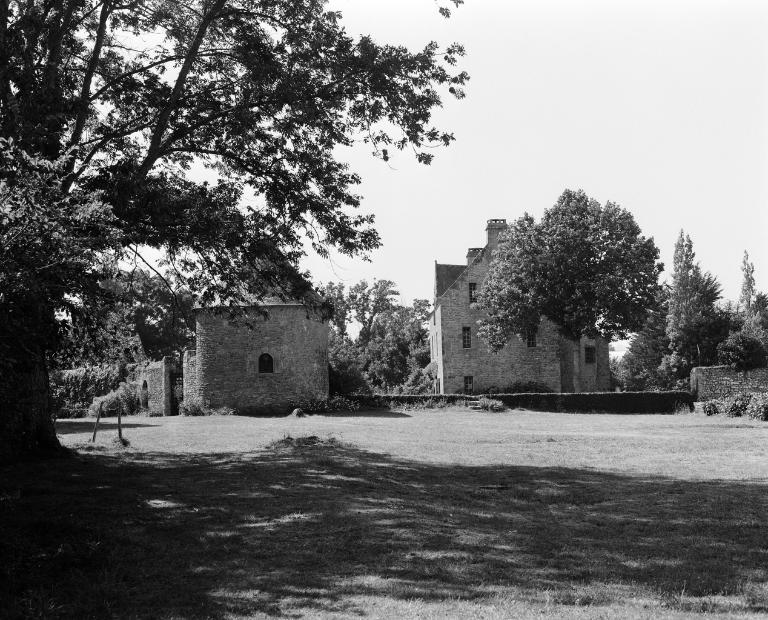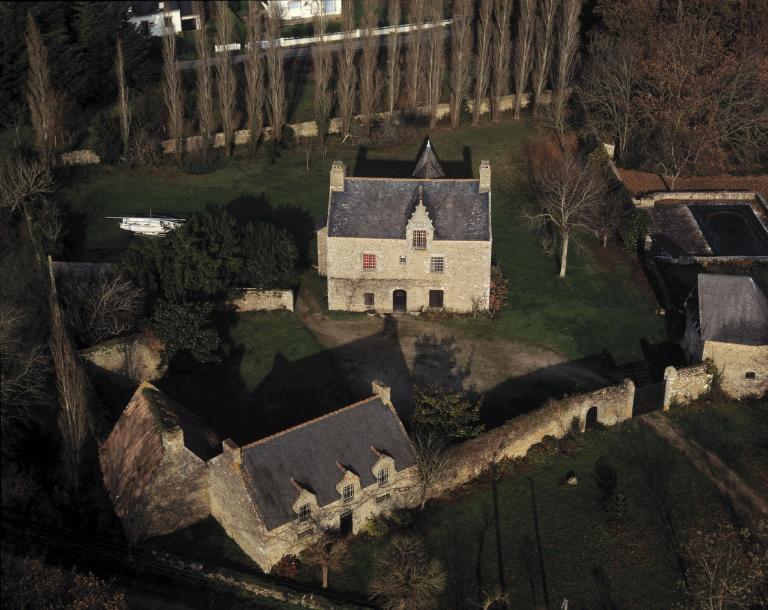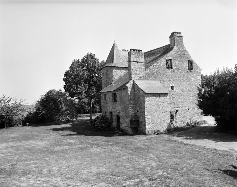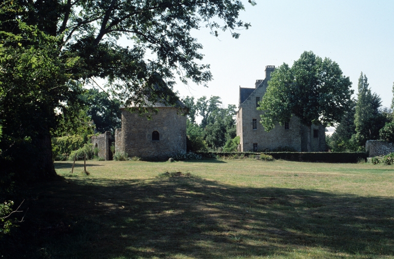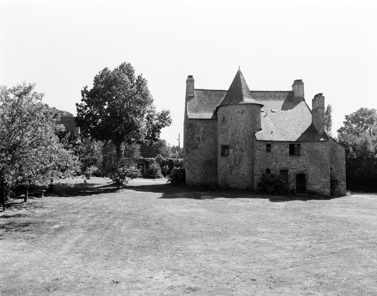 Logis en moellon de granite, à l'exception de la lucarne, en pierre de taille, à 1 étage carré et comble à surcroît ; toit à longs pans à pignon découvert, toit en appentis sur corps de cellier et latrines, toit polygonal avec noue sur la tour d'escalier. Enclos en moellon. Puits en moellon, superstructure en bois couverte d'ardoise. Dépendance à l'ouest en moellon, en rez de chaussée avec comble à surcroît couverte en chaume, avec toit à longs pans à pignon découvert. Chapelle en moellon, à vaisseau unique, toit à croupes à l'est, à pignon couvert essenté d'ardoises à l'ouest avec pigeonnier côté ouest.