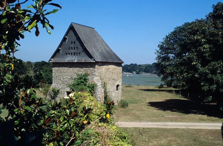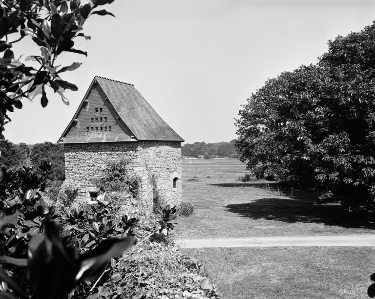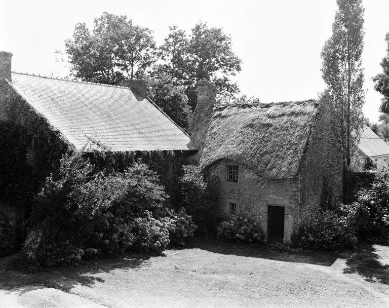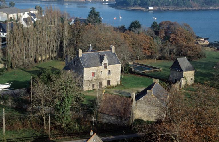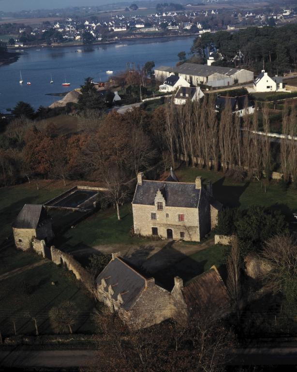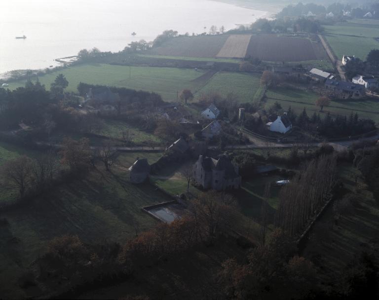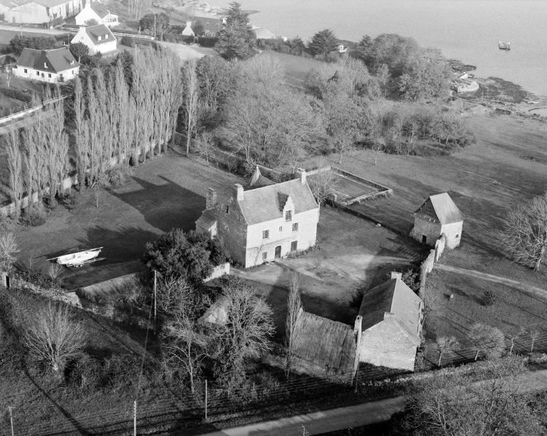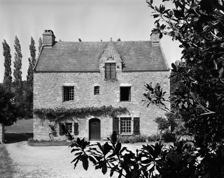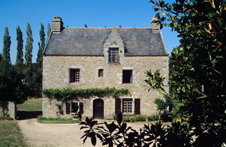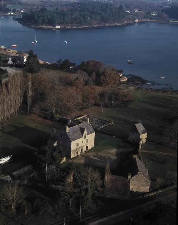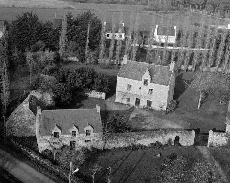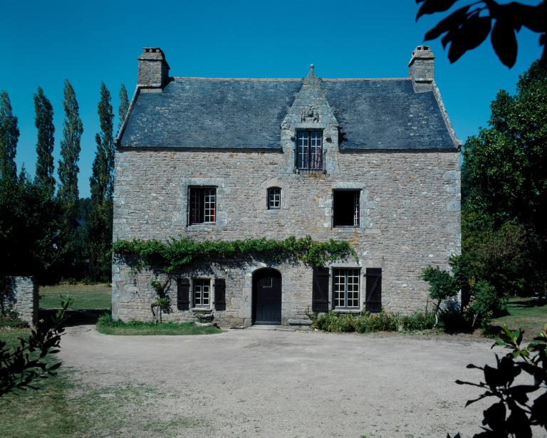 Logis en moellon de granite, à l'exception de la lucarne, en pierre de taille, à 1 étage carré et comble à surcroît ; toit à longs pans à pignon découvert, toit en appentis sur corps de cellier et latrines, toit polygonal avec noue sur la tour d'escalier. Enclos en moellon. Puits en moellon, superstructure en bois couverte d'ardoise. Dépendance à l'ouest en moellon, en rez de chaussée avec comble à surcroît couverte en chaume, avec toit à longs pans à pignon découvert. Chapelle en moellon, à vaisseau unique, toit à croupes à l'est, à pignon couvert essenté d'ardoises à l'ouest avec pigeonnier côté ouest.