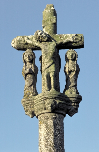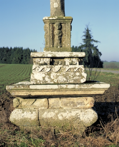 Calvaire sur base et soubassement de plan presque carré en forme d'autel galbé, sculpté de têtes d'angelots aux angles. Croix séparée du fût à pans coupés par un large noeud formant traverse intermédiaire, servant de base aux personnages latéraux. Fût chanfreiné sur socle indépendant monolithe creusé de niches à statuettes sur chacun des pans.