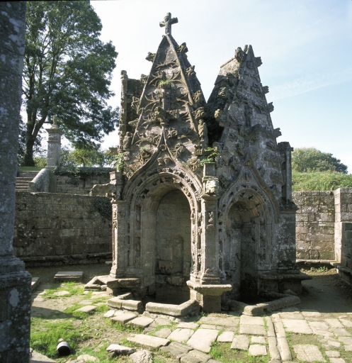 Les fontaines de dévotion dépendant toutes d'une chapelle dont elles sont souvent contemporaines. Elles remontent au 16e siècle pour les plus anciennes (Saint-Nicodème, fontaine 1 et Saint-Nicolas-des-Eaux), au 17e siècle (Vieux Rimaison), au 18e siècle (fontaine de Saint-Nicodème n°2 et la Ferrière) et 19e siècle (fontaine Saint-Eloi, fontaine de Gueltas). Quatre d'entre elles portent une date, 1608 (redatée, fontaine Saint-Nicodème 1), 1720 (fontaine Saint-Nicodème n°2) et 1727 (la Ferrière), la dernière date illisible à Saint-Eloi.