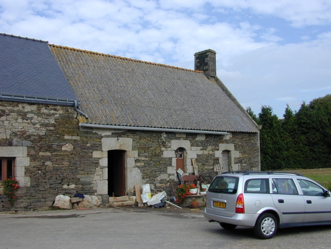 Premier logis et étable en moellon de schiste et granite, ouvertures en pierre de taille de granite, en arc sementaire pour le logis ouvert de deux fenêtres. Celui-ci est aujourd'hui couvert en ardoise. La crossette de son pignon découvert, à l'est, porte un masque sculpté. Une évacuation dans le mur de façade correspond sans doute à un évier mural. Le second logis de type ternaire avec trois lucarnes à fronton est construit en moellon régulier de granite, avec base et corniche en pierre de taille. Les niveaux sont soulignés d'un bandeau ; niche à vierge au dessus de la porte. Puits circulaire en pierre de taille de granite à margelle monolithe débordante.
