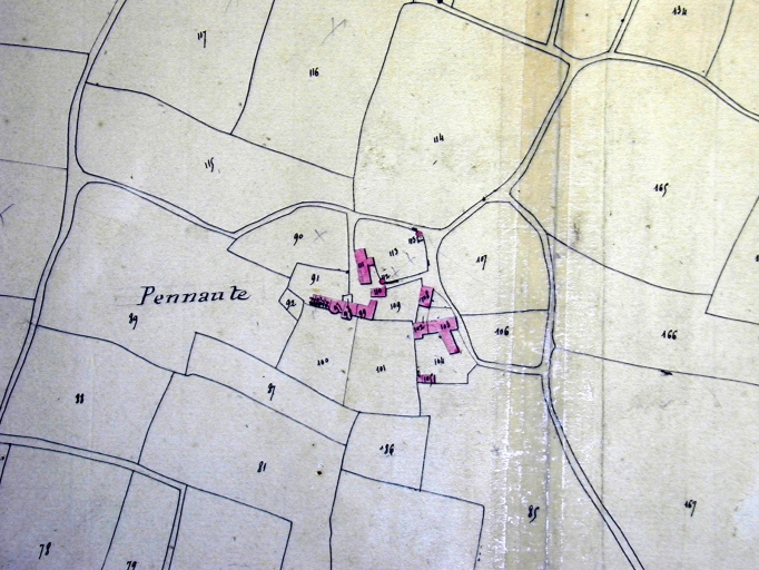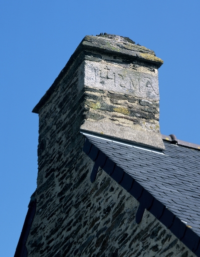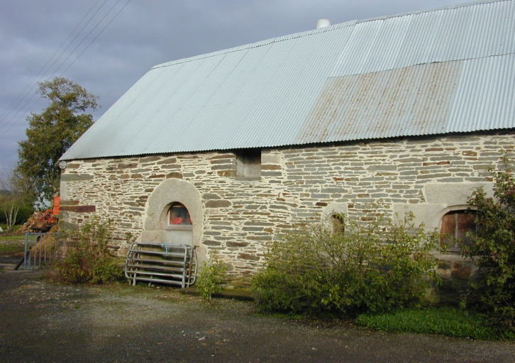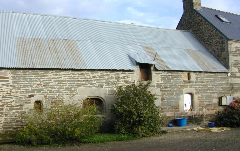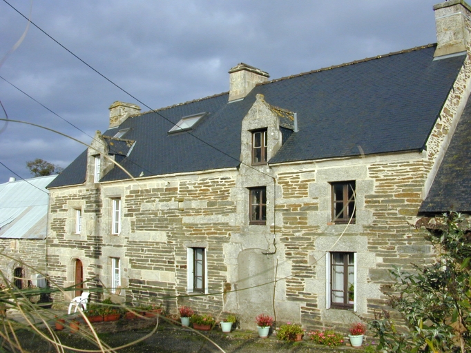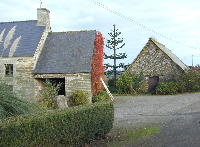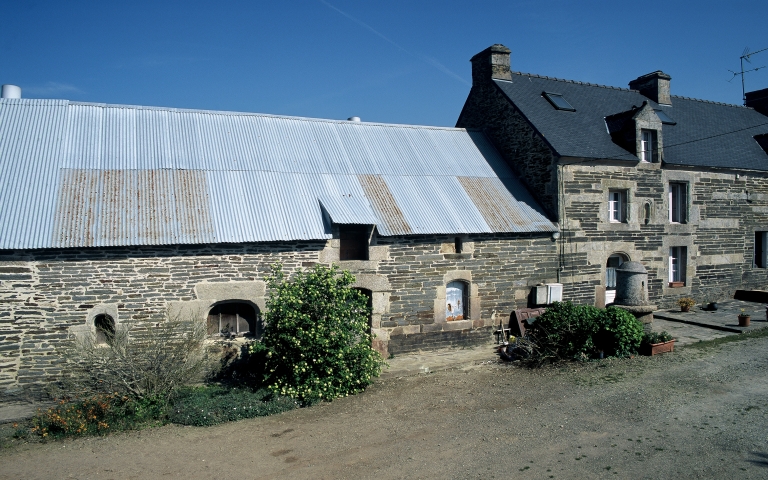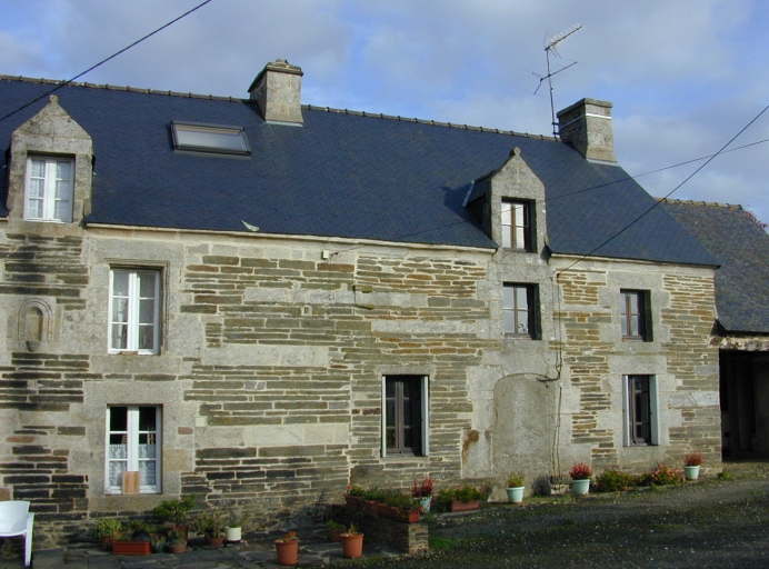 La première ferme construite en pierre de taille (logis) et moellon (étable, cellier) de schiste avec ouvertures en granite, initialement de type logis-étable à porte unique, devenu logis-étable à deux portes au cours du 18e siècle. Cellier en prolongement. Second logis en alignement à l'est en pierre de taille de schiste et granite, à étage carré, à une pièce par niveau. Sur la souche de cheminée sont sculptés les monogrammes IHS et MA. Le sol devant la maison est dallé de schiste. Troisième logis en alignement du précédent à étage carré. Puits en forme de guérite en pierre de taille de granite, base en moellon de schiste. Une cave (cellier) au nord de l'alignement est construite en moellon de schiste, et aujourd'hui couverte en tôle. Les murs latéraux, très bas permettent un très grand développement du comble.