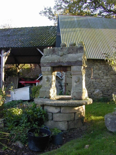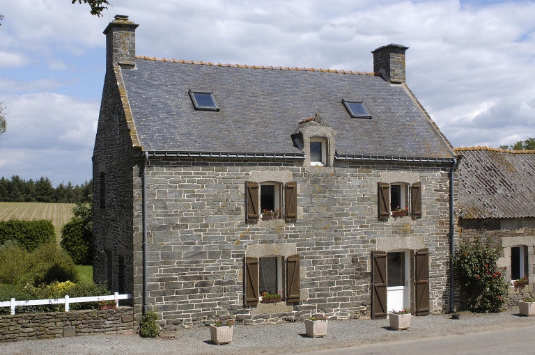 Logis à une pièce en rez-de-chaussée et à l'étage, en pierre de taille de schiste et ouvertures en granite. Etable en alignement à comble à surcroît en pierre de schiste et ouvertures en granite, aujourd'hui couverte en fibro-ciment. Puits circulaire en pierre de taille de granite, incluant une dalle de schiste au niveau de la traverse, à montants et traverse sculptés de têtes d'angelots. Fournil jouant également le rôle de charretterie en moellon de schiste, couvert en tôle ondulée. Hangar sur piliers de bois couverte en fibro-ciment.