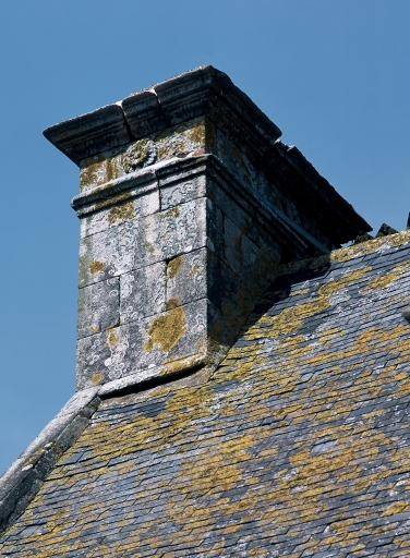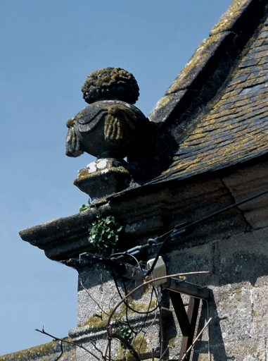 Les rampants du toit à pignon découvert portent une urne avec draperies et bouquet floral. La souche de cheminée est sculptée d'une fleur. Un décor floral orne le haut du mur gouttereau sous la corniche.