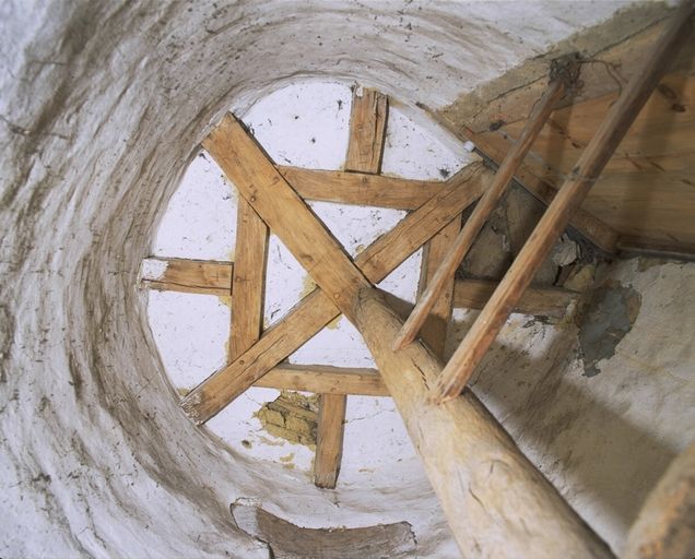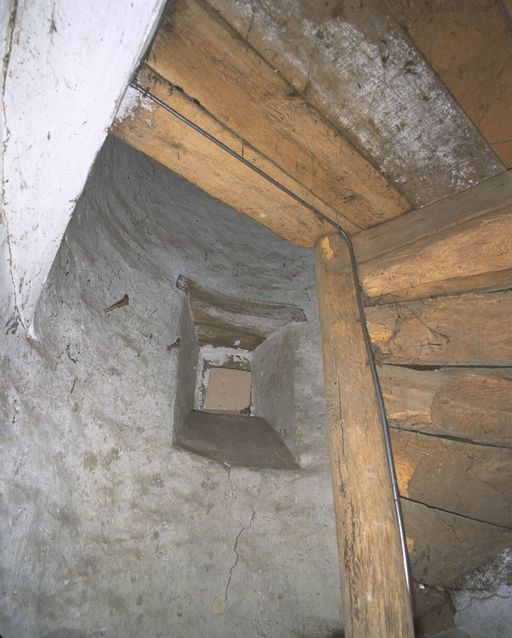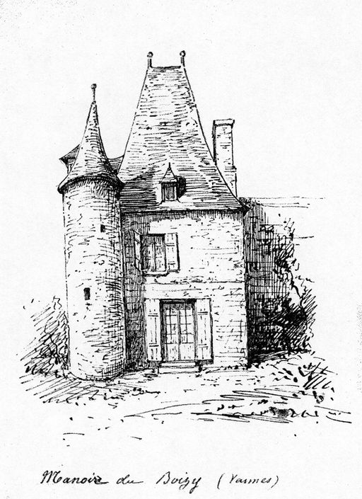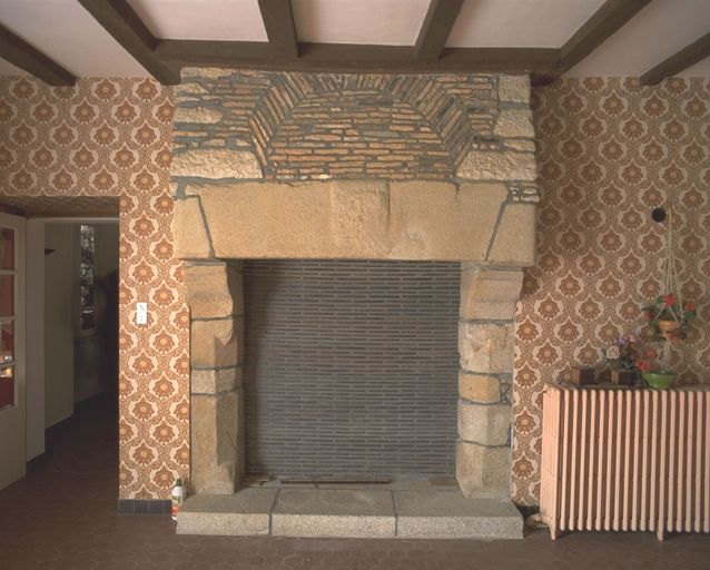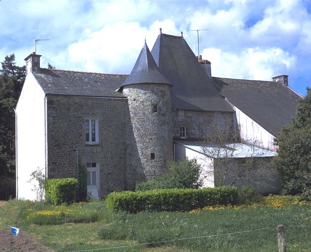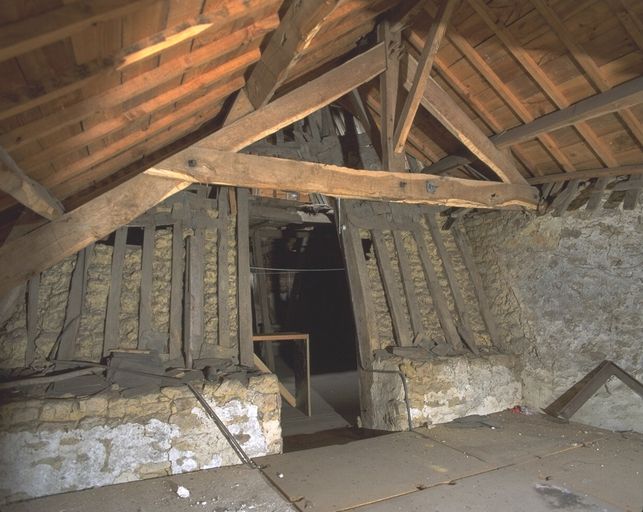 La composition initiale du manoir est partiellement révélée par une haute toiture centrale en pavillon et par la tour d'escalier postérieure. Sa structure initiale, classique pour la deuxième moitié du 16e siècle, se composait de deux pièces en rez-de-chaussée, salle et cuisine, surmontées de deux chambres, distribuées par un escalier en vis dans une tourelle hors-oeuvre sur la façade postérieure. La salle, de dimensions très modestes, subsiste, ainsi que la chambre qui la surplombe. L´une et l´autre ont conservé leurs cheminées d´origine, ornées d´un blason, buché sur le linteau de la cheminée de la salle, apparent mais non identifié dans la chambre. Les poutres, conservées dans la salle, sont sans doute cachées par le faux plafond dans la chambre. L´escalier en vis en bois de chêne est intact dans la tourelle. La partie est, visible sur le plan cadastral de 1844, a disparu entre cette date et l'époque où Galles fait un dessin de la façade postérieure, dans la deuxième moitié du 19e siècle. Le haut d'un piédroit de cheminée déposé dans la cour (fig.6) pourrait provenir de cette partie disparue, probablement de la cuisine au rez-de-chaussée.