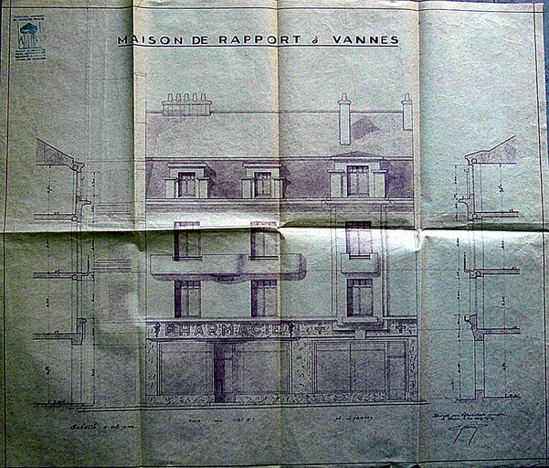 Né le 29 avril 1884 à Cossé-le-Vivien, dans la Mayenne, Edmond (Louis) arrive à Vannes avec sa famille en 1885. Joseph Louis Gemain, son père, est employé comme herboriste dans une pharmacie ; Emma Ruzeau, sa mère, est sage-femme. Après des études à l’Ecole des Arts décoratifs à Paris, Edmond Gemain s’installe comme architecte à Vannes, en 1908, au 10 place de l’Hôtel de Ville. Il épouse la même année à Saint-Brieuc Jeanne-Marie Moënner. Le couple aura quatre enfants : Edmond (1909), Jean (1911), Annick (1913) et Yves (1914). De 1909 à 1913 il habite 39 rue du Mené. En 1913-1914, on le retrouve chez ses parents au 39 rue Jeanne d’Arc. A partir de 1920 et jusqu’à sa mort le 10 août 1953, il sera fidèle au 19 de la rue Pasteur qui abrite son domicile et ses bureaux. La maison est démolie par son fils, également architecte, qui construit à son emplacement vers 1972 un immeuble de logements. (sources : recherches de Jacques Delarue).