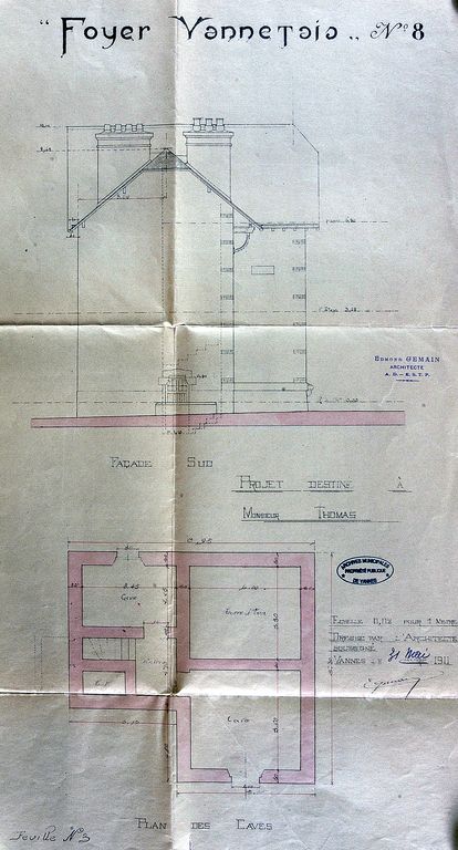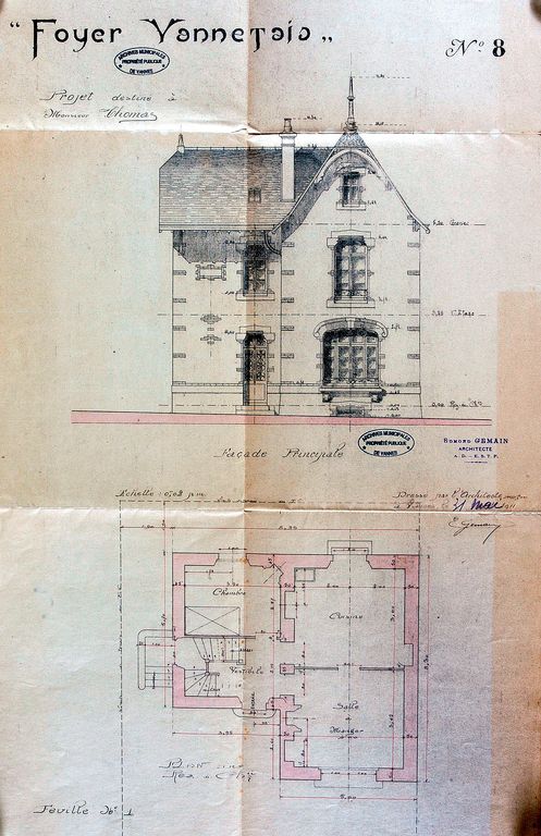 Né le 29 avril 1884 à Cossé-le-Vivien, dans la Mayenne, Edmond (Louis) arrive à Vannes avec sa famille en 1885. Joseph Louis Gemain, son père, est employé comme herboriste dans une pharmacie ; Emma Ruzeau, sa mère, est sage-femme. Après des études à l’Ecole des Arts décoratifs à Paris, Edmond Gemain s’installe comme architecte à Vannes, en 1908, au 10 place de l’Hôtel de Ville. Il épouse la même année à Saint-Brieuc Jeanne-Marie Moënner. Le couple aura quatre enfants : Edmond (1909), Jean (1911), Annick (1913) et Yves (1914). De 1909 à 1913 il habite 39 rue du Mené. En 1913-1914, on le retrouve chez ses parents au 39 rue Jeanne d’Arc. A partir de 1920 et jusqu’à sa mort le 10 août 1953, il sera fidèle au 19 de la rue Pasteur qui abrite son domicile et ses bureaux. La maison est démolie par son fils, également architecte, qui construit à son emplacement vers 1972 un immeuble de logements. (sources : recherches de Jacques Delarue).