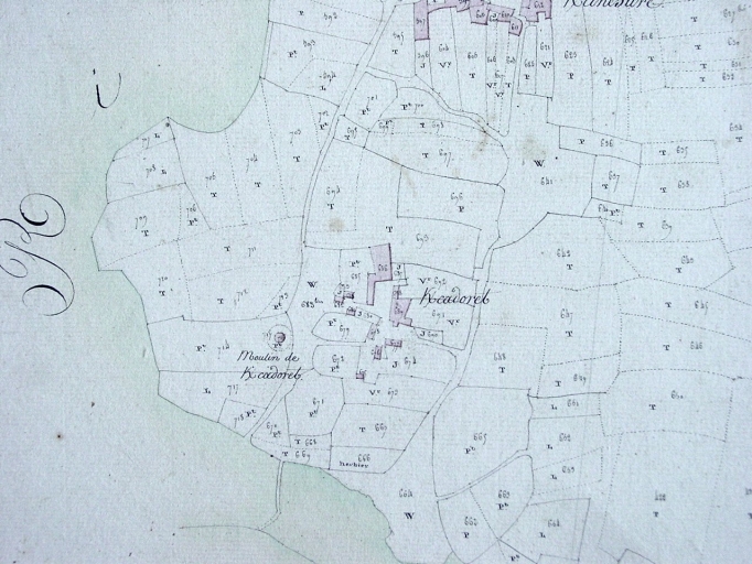 On a trouvé en 1888 à Kercadoret, un lot de 70 haches en bronze (Le Mené, 1891-1894). Le moulin à vent de Kercadoret, dépendait au 17e siècle de la seigneurie de Kercadio, en Erdeven (Déclaration de J. Gouyon, en 1679, (AD56, 3A3, Domaine royal d'Auray). Il figure sur les plans cadastraux de 1811 et 1845. Une maison de prêtre, bâtie dans village, mais fortement remaniée au 19e puis au 20e siècle, porte le nom de son propriétaire : LE CADIC et la date de 1620. Elle est identifiée en 1741 sous le nom de Cambre-er-bellec, dans une déclaration du sieur de Kercadio (AD56, 6E 2041).