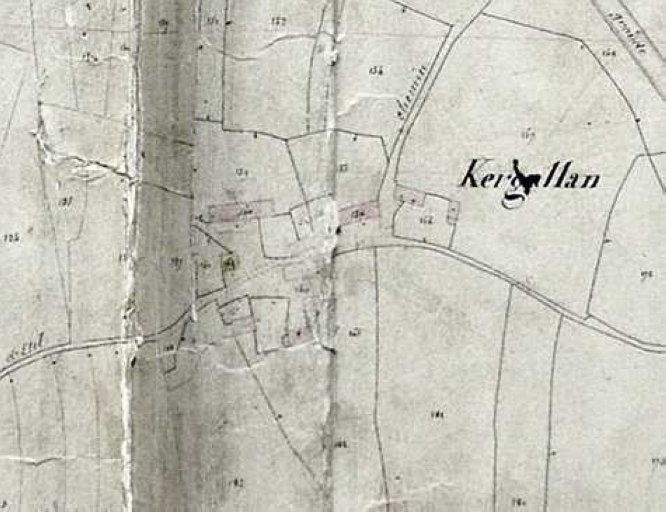 Kergallan est situé au sud de la commune, à l'est d'un affleurement de roches naturelles. Un chemin principal traverse le village d'est en ouest. Un autre rejoint le bourg au nord. L'habitat y est généralement remanié. 3 maisons fermes de la première moitié du 20e siècle sont repérées. La maison n°1 (E 85, 1310-1312) est une maison à étage de faux type ternaire actuellement à deux portes car divisée en deux propriétés. La porte centrée indique les années 1910-1920, et la reprise de la chaîne d'angle confirment une surélévation opérée probablement à cette même période. La ferme n°2 (E 86) date également des années 1920. Elle est située en alignement de la précédente et la maison à deux travées présente le même enduit avec soubassement traité en faux appareil, que la voisine. Les pignons et souches de cheminées à corniche de ces deux maisons confirment la reprise de bâtiments de la seconde moitié du 19e siècle. La ferme n°3 (E 62) est un logis étable à deux portes construit à la fin du 19e siècle dont les baies sont remaniées vers 1920.
