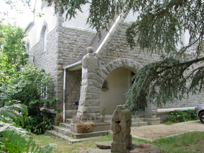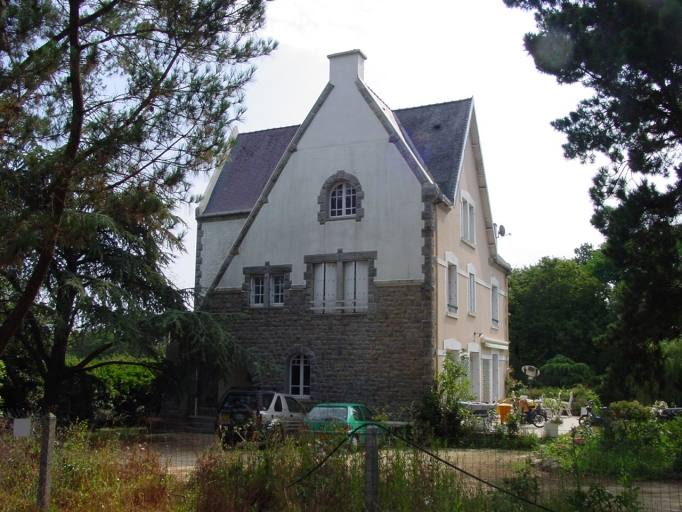 Située en bordure et au sud de la D 16 (route d'Auray), cette maison est un intéressant exemple d'architecture d'esprit régionaliste. Les hauts pignons découverts et l'appareil de granite employé en parement des façades expriment l'attachement aux formes traditionnelles de l'habitat. Chaque façade offre un traitement particulier : terrasse à l'étage avec pergola, à l'est, balcon sur bow-window, au nord, entrée principale sous porche dans oeuvre, à l'ouest, façade traditionnelle de type ternaire, sur terrasse de jardin au sud. La toiture constituée d'un entrecroisement de deux toits de long pans, offre un pignon sur chaque façade. Soubassement, rez-de-chaussée et parties d'étage sont traités en pierre de taille de granite gris éclaté, ainsi que les entourages de baies (sauf au sud), les chaînes d'angle et les rampants des pignons découverts. Les parties hautes des façades, étage et pignons, sont recouvertes d'un enduit. A l'ouest, le porche dans oeuvre, couvert par l'extrémité basse d'un pan de toit, est une particularité.