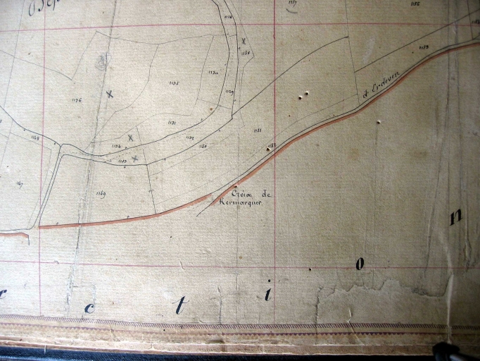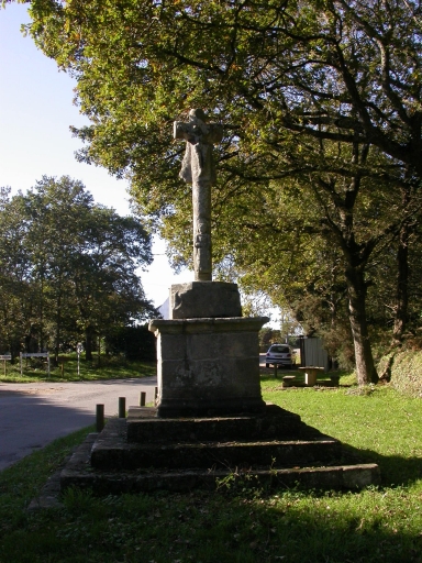 La croix est érigée dans la 2e moitié du 16e siècle par un prêtre habitant le village voisin de Kermarquer, dont l'effigie figure à la base du fût. L'abbé Le Tallec émet l'hypothèse qu'il pourrait s'agir de Guillaume Madec, habitant Kermarquer, curé de 1633 à 1642. Cependant cette date paraît tardive et surtout en contradiction avec la forme du pied du calice porté sur la cheminée de la maison de Kermarquer, forme qui appartient au 16e siècle. Il mentionne également la restauration de la croix en 1898 par François Douarin de Mane Kerverrec et Pierre Tallec de Kerran, qui avait fait la croix de la fontaine Saint-André.