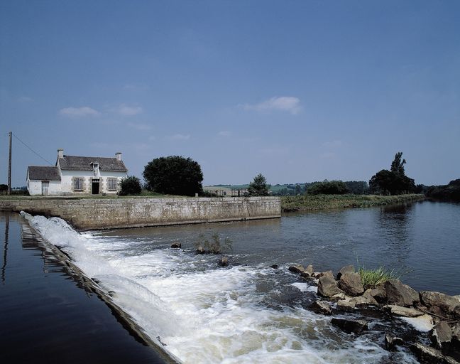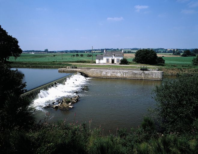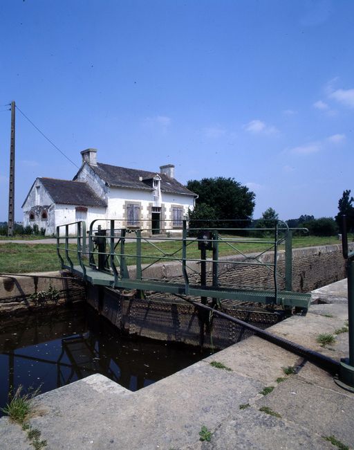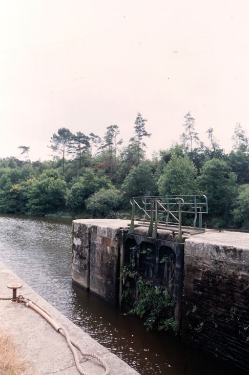 Écluse à sas ; moellons de schiste, pierre de taille de granite. État actuel : porte aval métallique à panneaux de bois. Déversoir & vanne au niveau de la porte amont. Déversoir rectiligne. Vanne contre la rive opposée à l'écluse ; culée et îlot : pierre de taille de granite. État actuel : passerelle et vannes métalliques récentes.