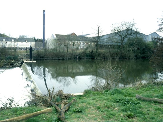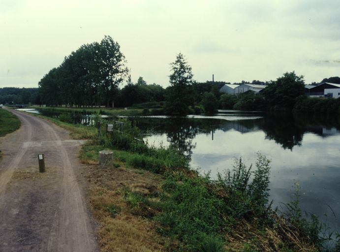 Site de qualité. Alignement de hêtres. Rive opposée : usine avec cheminée métallique contemporaine.