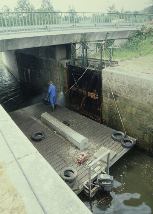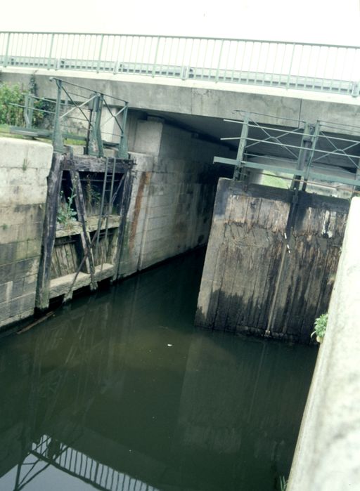 L'écluse conserve une porte aval à deux vantaux en bois - première génération avant remplacement systématique à la fin du 19 siècle (?).