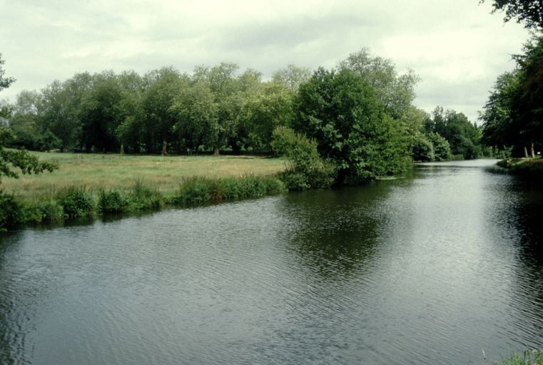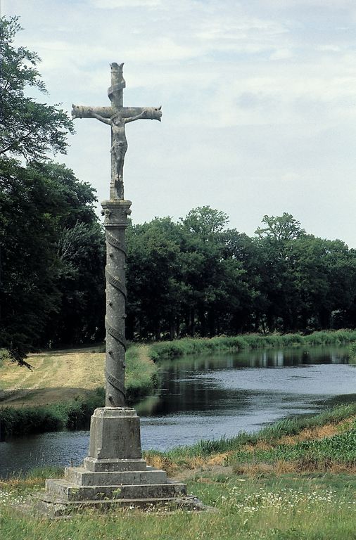 Confluent de l'Oust et du Lié ; proximité des Forges de Lanouée ; canal de dérivation et barrages. Croix de chemin du 19e siècle.
