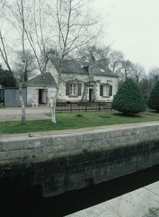 Écluse à sas ; pierre de taille de granite ; bittes d'amarrage. Déversoir rectiligne ; îlot : pierre de taille de granite. Vanne contre la rive opposée à l'écluse ; culée : pierre de taille de granite. État actuel : passerelle et vannes métalliques récentes. En amont : Fontaine Saint-Bertin. Élargissement du canal à hauteur de Carhuel. Cale de Carhuel Bac (privé).