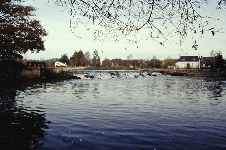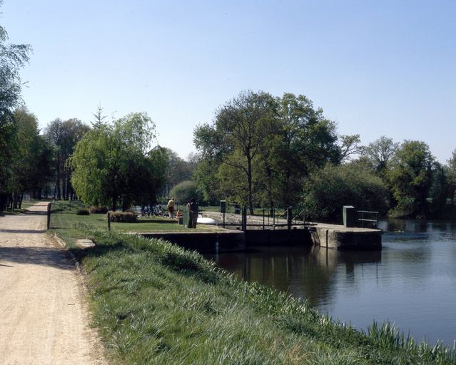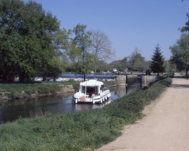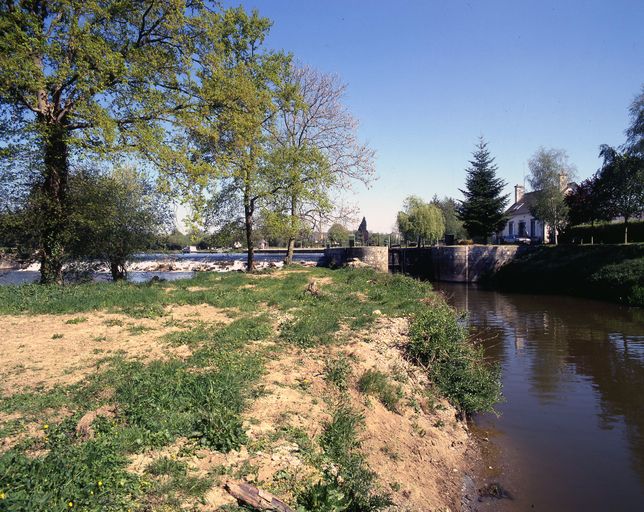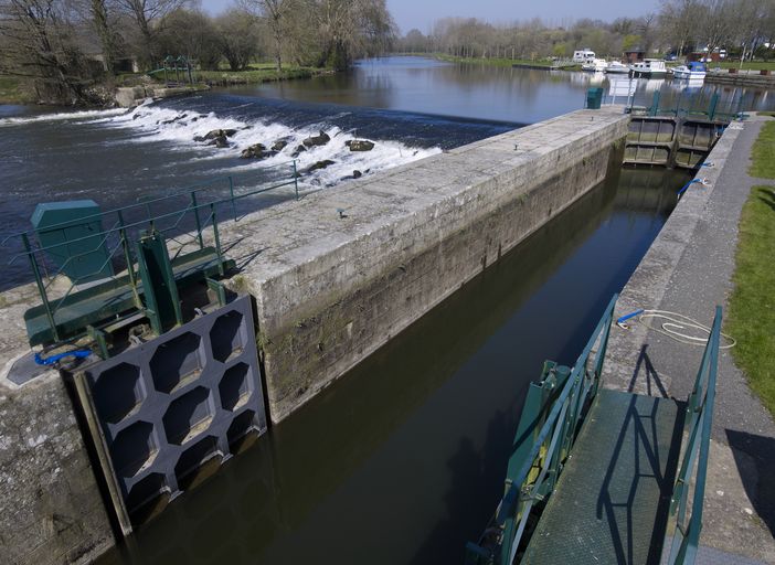 Écluse à sas ; pierre de taille de granite ; pare-gravier : moellon de schiste (?), parements : grand appareil de granite ; bittes d'amarrage. État actuel : écluse électrifiée Déversoir rectiligne. Vanne contre la rive opposée à l'écluse ; culée et îlot : pierre de taille de granite. État actuel : passerelle et vannes métalliques. Embarcadère à 70 m en amont. Bac (public) à 100 m en aval.