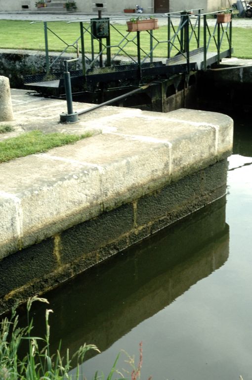 Écluse à sas ; pierre de taille de granite ; bittes d'amarrage. Système de vannage et rigole de ruissellement derrière la maison éclusière.