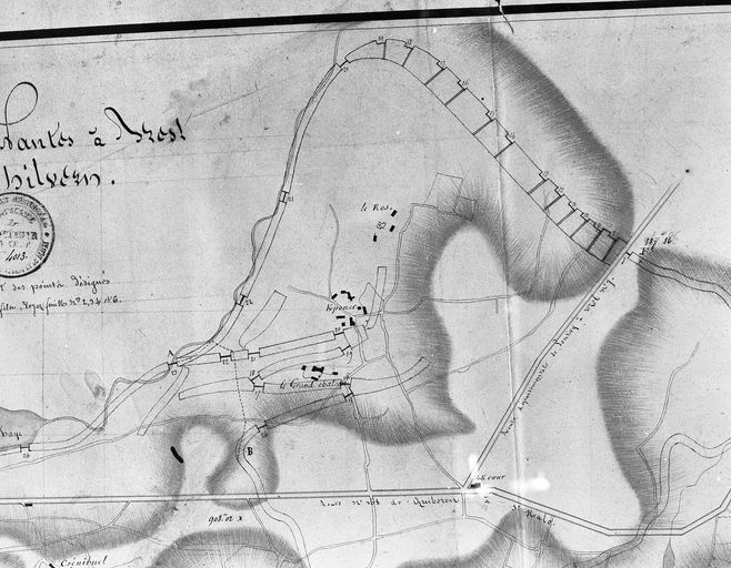 Canal de Nantes à Brest. Département du Morbihan. Carte de la portion du canal de Nantes à Brest qui serait comprise entre Pontivy et Hilvern. Plan, par Lenglier, ingénieur en chef des Ponts et Chaussées, 15 décembre 1825. Papier, encre, aquarelle, 57x138 ; échelle : 1 : 10000.