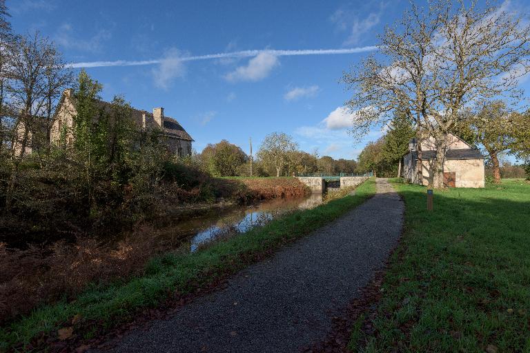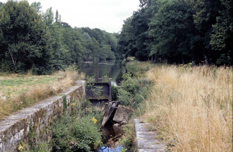 Écluse à sas ; grand appareil de granite ; porte amont métallique, porte aval : cadre métallique et panneaux de bois ; bittes d'amarrage. État actuel : bajoyer de la rive gauche et porte amont écroulés dans le sas. Déversoir rectiligne. État actuel : passerelle métallique récente. Pertuis à l'extrémité du déversoir. Passerelle récente sur rivière : bois et ciment, reposant sur deux piles de granite polygonales. Deux bornes kilométriques en aval.