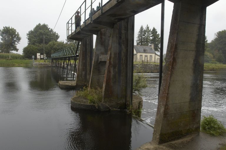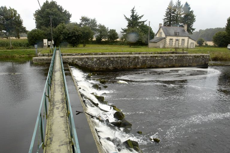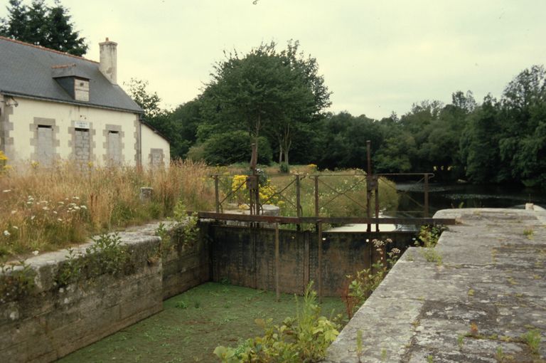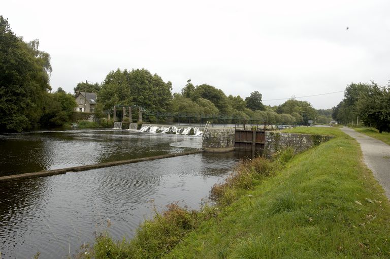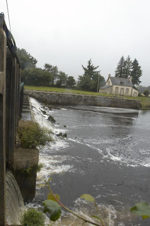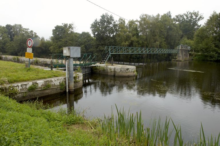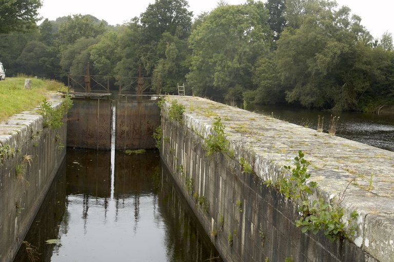 Écluse à sas ; pierre de taille de granite ; musoirs arrondis ; pare-gravier : pierre de taille de granite ; bittes d'amarrage. État actuel : porte aval métallique, porte amont : métal et bois. Déversoir & vanne au niveau de la porte amont. Déversoir rectiligne ; îlot : pierre de taille de granite. État actuel : passerelle métallique récente d'une rive à l'autre. Vanne contre la rive opposée à l'écluse ; culée et îlot : pierre de taille de granite. État actuel : superstructure de béton, deux vannes récentes.