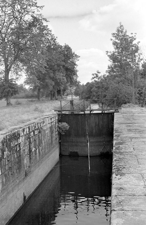 Écluse à sas ; pierre de taille de granite ; musoirs arrondis ; bittes d'amarrage. État actuel : portes métalliques. Déversoir & pertuis au niveau de la porte amont. Déversoir rectiligne ; îlot : pierre de taille de granite. État actuel : passerelle métallique récente d'une rive à l'autre. Pertuis contre la rive opposée à l'écluse ; culée : pierre de taille de granite. État actuel : superstructure de béton, deux vannes métalliques récentes.