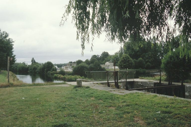 Écluse à sas ; moellons de granite, parements supérieurs : pierre de taille de granite ; pare-gravier : pierre de taille de granite et schiste ; bittes d'amarrage. État actuel : porte aval à passerelle récente : vantaux métalliques ; porte amont partiellement détruite, sans passerelle. Déversoir rectiligne. État actuel : passerelle métallique récente.