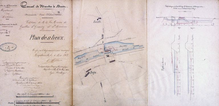 Canal de Nantes à Brest. Demande d'un débarcadère. Pétition de MM. les Maires de Gueltas, St-Gonnery et St-Maudan. Plan des lieux. Dessin, par Le Mellant (?), ingénieur des Ponts et Chaussées, le 4 mai 1863. Papier, encre, aquarelle, 31x63. Echelle du plan : 1 : 2000 ; échelle des profils : 1 : 200 et 1 : 500.