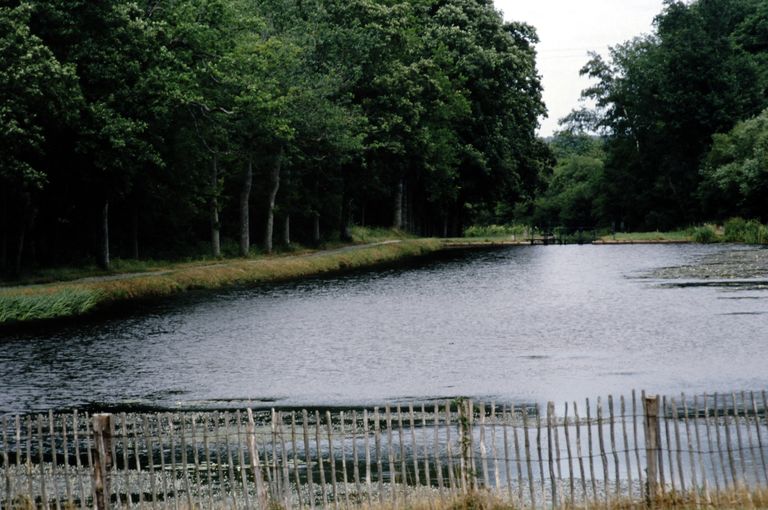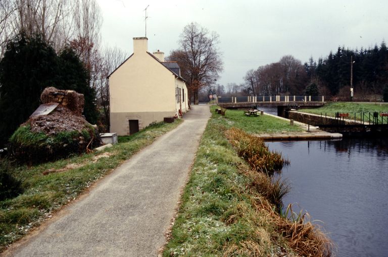 Adjudication lancée le 30 avril 1826, passée le 28 juin 1827 en faveur de Rest qui fut remplacé à partir de décembre 1828 par Thonisssen. Achèvement de la totalité des travaux en novembre 1835. A la suite d'une pétition des maires de Gueltas, Saint-Gonnery et Saint-Maudan, décision d'établir un lieu de dépôt ou un embarcadère à l'amont de la digue sur le contre-terre-plein (rive gauche) de l'écluse 59 par lettre du 21/05/1863. Plan des lieux établi par l'ingénieur ordinaire [Le Hil..], daté du 4 mai 1863.
