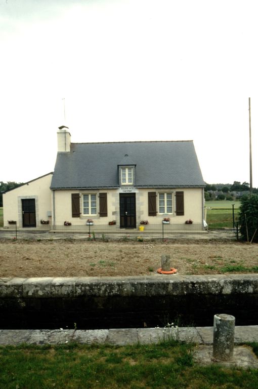 Écluse à sas ; moyen appareil de granite, parements supérieurs & chaînes d'angle : grand appareil de granite ; bittes d'amarrage. Première borne kilométrique avec l'inscription : NAPOLEONVILLE effacée (opération systématique vers Pontivy).