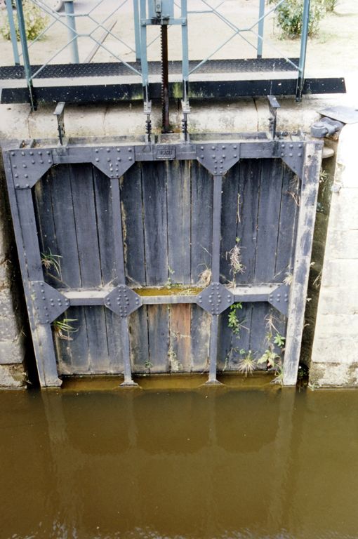 Écluse à sas ; moyen appareil de granite, parements supérieurs & chaînes d'angle : grand appareil de granite ; porte à panneaux de bois ; bittes d'amarrage.