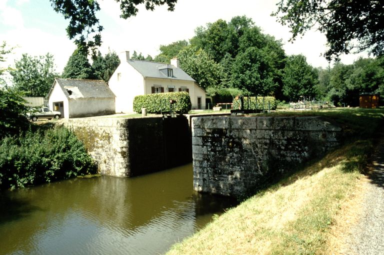 Écluse à sas ; moyen appareil de granite, parements supérieurs & chaînes d'angle : grand appareil de granite ; bittes d'amarrage.