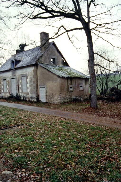Logis : plan de type ternaire en rez-de-chaussée ; comble à lucarne et fenêtre dans chaque pignon ; fenêtres de grandes dimensions (h = 206, la = 96) ; murs : moellons de schiste enduits ; encadrements des baies harpés : pierre de taille de granite ; une souche de cheminée décalée sur chaque versant du toit. Deux dépendances ; encadrements des baies : pierre de taille de granite ; à droite : toit en appentis ; murs : moellons de granite enduits ; deux fenêtres rectangulaires dans le mur gouttereau ; à gauche, dépendance isolée du logis ; toit à longs pans ; murs : moellons de schiste. État actuel : toiture du logis en ruine ; dépendance de droite entièrement désolidarisée du logis ; maison à l'abandon, menacée.