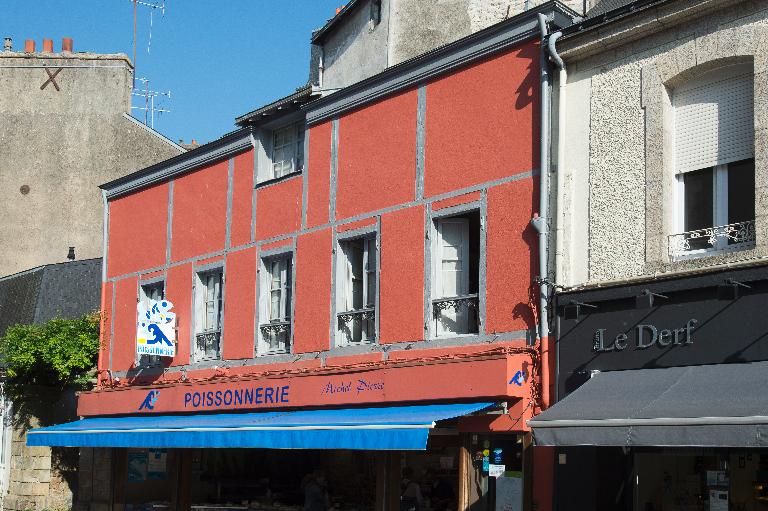 Maison simple en profondeur bâtie en alignement de rue montrant un étage carré et une façade à pan de bois très simple.