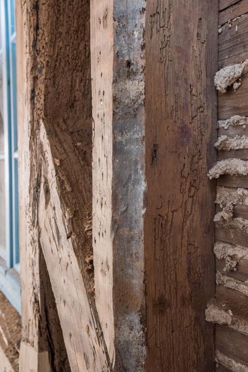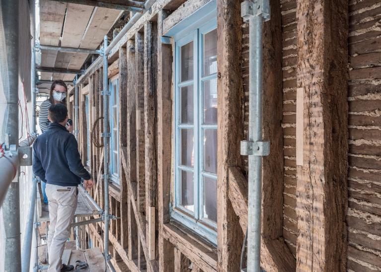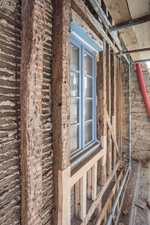 La restauration réalisée en 2021 fait apparaître le pan de bois, pourtant prévu initialement pour être couvert.