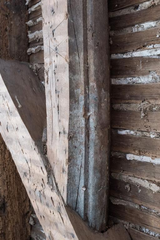 Mise à nu par la restauration de 2021, la structure en pan de bois se compose de poteaux et d'écharpes. Elle compte de très nombreuses pièces en remploi, probablement issues de la façade précédente en encorbellement. Initialement destinée à être enduite pour protéger et dissimuler le pan de bois strictement fonctionnel, la façade est désormais mise en couleur avec des bois peints en vert et un hourdis clair.