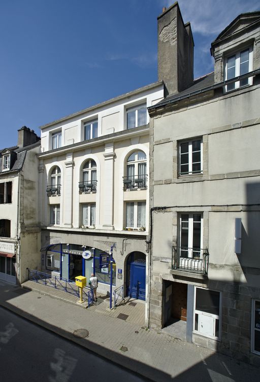 Immeuble bâti en retrait de rue à plan double en profondeur de 3 étages carrés. Il montre une élévation enduite ordonnancée de 3 travées séparées par des pilastres avec arcade unique pour les ouvertures des 2 premiers étages. Porte d'entrée latérale sur un couloir avec escalier tournant à retours sans jour.