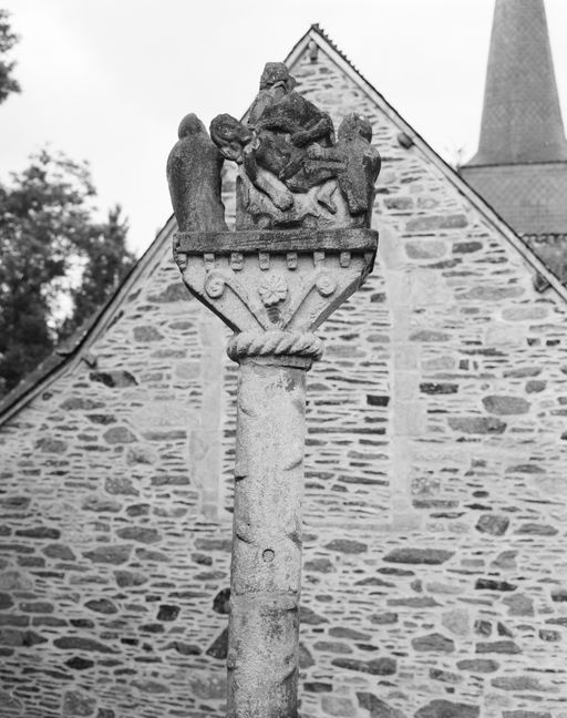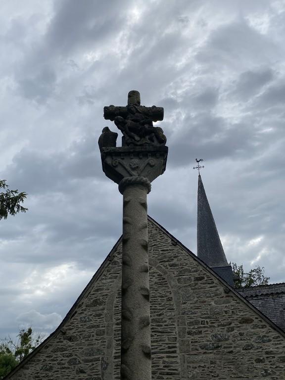 Croix en granite monolithe sur socle, soubassement de maçonnerie et emmarchement qui servait peut-être de table d'offrande ; fût en granite, de section circulaire, écoté ; il est cassé. Décor en haut-relief ; sur une face : Calvaire, dont le Christ a les pieds posés l'un sur l'autre ; sur l'autre face : Vierge de Pitié.
