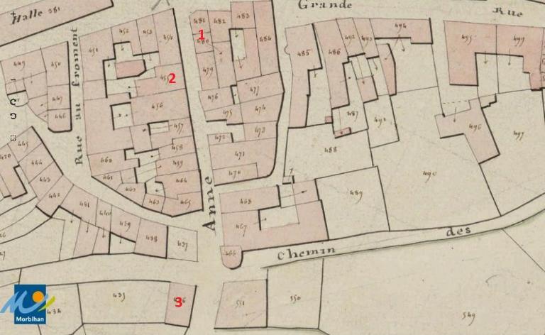 N° 15-17 : Les deux maisons constituent un ensemble construit à la limite des 19e et 20e siècles. La maison d’angle reprend l’emplacement de l’ancienne porte Sainte-Anne, dont la tour est encore visible sur le cadastre de 1829 ; elle comporte deux étages. L'élévation ordonnancée à quatre travées met le pan coupé en valeur en superposant trois niveaux de portes-fenêtres. Les murs en moellons de schiste sont enduits pour mettre faire ressortir les encadrements des baies, les chaînes d’angle, les bandeaux et les corniches moulurées en pierre de taille de granite ; l’enduit de la maison du n°15 a été supprimé.