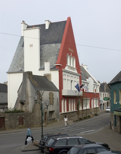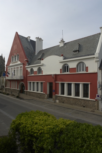 La mairie-école est une oeuvre savante dans sa composition, qui met l'accent sur plusieurs traits : tout d'abord, la partie réservée à la mairie (et au bureau de poste, sans traitement particulier) est fortement accentuée par son haut pignon, mais aussi par le traitement solennel réservé aux ouvertures de la salle du conseil, quatre fenêtres à croisées rappelant l'architecture médiévale, tandis que la serlienne du comble fait référence à la Renaissance italienne. On remarquera la diversité des formes d'ouvertures, différenciées à chaque niveau et pour chacune des parties. La polychromie mise en oeuvre, bien restituée par la dernière restauration contribue à souligner le jeu des ouvertures. L'architecte Bardet (ou plus probablement Lamourec) signe son oeuvre par quelques traits caractéristiques qui l'ancrent dans la production contemporaine et le style régionnaliste : les pignons découverts, l'utilisation de granite pour le soubassement, mais aussi les piles rondes séparant les ouvertures en série.