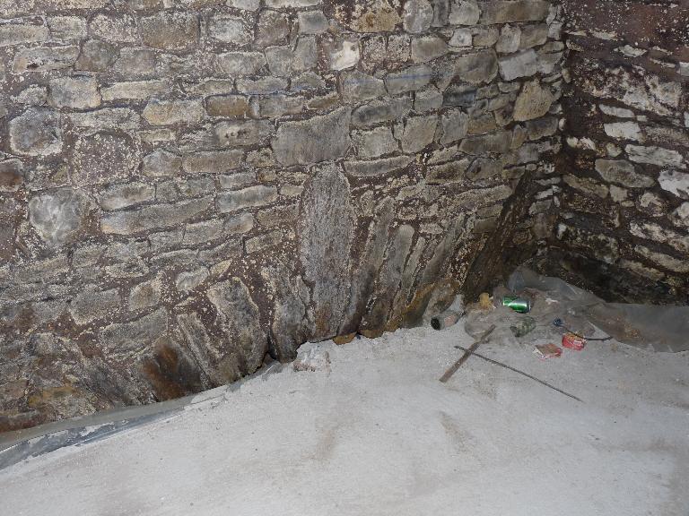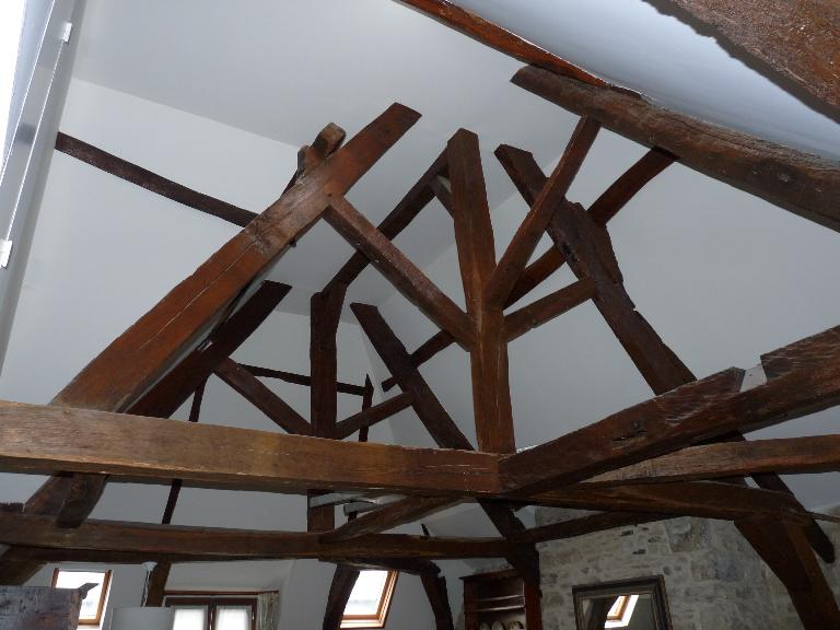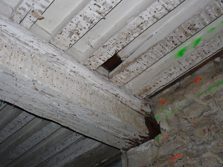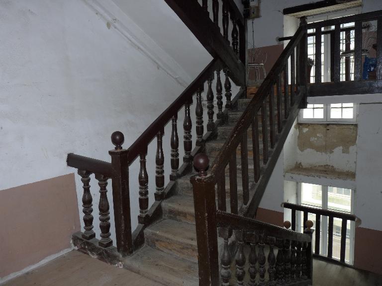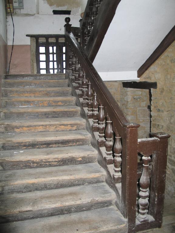 Les pièces avec les planchers à la française et les cheminées correspondent bien au 17e siècle. Cependant, il n'est pas certain que l'escalier aujourd'hui emprunté était celui qui desservait ces pièces à l'époque. En 1687, le partage en deux "lotties" égales de cet hôtel entre Hierosme de Quintin, seigneur de Saint-Denac et Gratien Josset, sieur de Kervillart, héritier de Damien Bonfils, décrit l'édifice de la façon suivante : une cave au-dessous de la chambre basse de devant sur la rue au niveau du rez-de-chaussée, surmontée de deux chambres au-dessus et d'un grenier ; au-derrière une grande cave, une cuisine sur cour surmontée de deux chambres et d'un grenier. Cette division de propriété de la maison au niveau des étages (rez-de-chaussée avec premier étage et une partie de cave puis deuxième étage avec greniers et autre partie de cave) explique peut-être la situation de l'escalier actuel sous appentis en façade nord de l'hôtel qui n'est pas l'escalier d'origine et qui aurait été rejeté à cet endroit pour faciliter l'indépendance des deux logements. Le coup de sabre en façade sur la cour intérieure du corps de l'escalier, le type de balustres utilisées plutôt de la fin du 17e siècle-debut 18e siècle (même si certaines d'entre elles ont été remplacées), les ouvertures sur palier plus tardives ainsi que le mur est de la cage où l'on distingue d'anciennes ouvertures bouchées renforcent cette hypothèse. Le passage situé entre le corps sur rue et le corps arrière est peut-être l'emplacement de l'escalier d'origine, modifié en tout cas par la suite. Le mur extérieur correspondant à ce passage façade ouest de l'hôtel donnant sur la cour intérieure de l'hôtel du Faouédic montre de l'intérieur qu'il a été visiblement plaqué en retrait de la façade pour fermer ce passage. La place de l'escalier d'origine reste à confirmer.