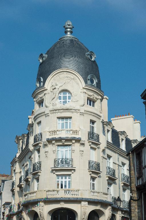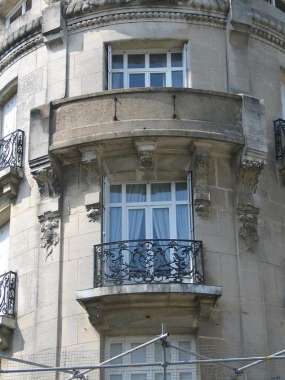 Important immeuble construit en alignement de rue sur une large parcelle d'angle. A plan double en profondeur, l'immeuble montre une élévation sur entresol de 4 étages carrés sous dôme circulaire et de 2 étages carrés sous toit à longs pans brisés. La partie d'angle est traitée en rotonde sur de hautes arcades et reçoit un décor néo-classique en calcaire. Pour l'édification de la coupole, l'édifice est en béton armé enduit selon le procédé Hennebique. Soubassement partiel en granite .