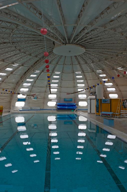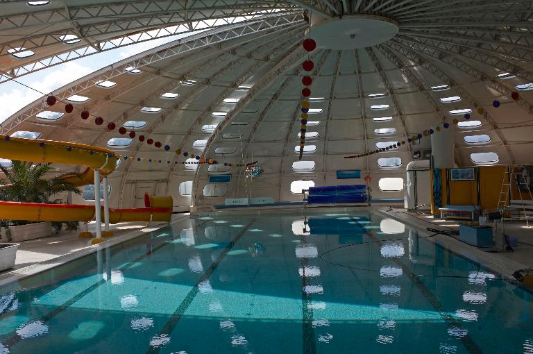 Les caractéristiques sont celles de toutes les piscines Tournesol : un bassin de 25 m x 10 m abrité sous une coupole en tuiles polyester percée de hublots circulaires, dont un secteur de 120 degrés orienté au Sud-Est s’ouvre en dégageant toute la longueur du bassin.