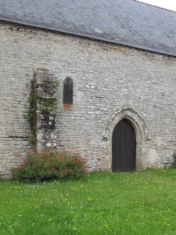 Édifice de plan rectangulaire, construit en grand et moyen appareil de granite gris. Deux contreforts sur le mur sud et quatre contreforts d'angle. Portes à cintre brisé, sauf celle du nord, rectangulaire à coussinets ; celle de l'ouest est ornée de deux figures et d'un écu muet. Clocheton au milieu de l'édifice, disparu au début du 20e siècle (Le Mené). Charpente et toiture refaites, en conservant le coyau et intérieur rénové.