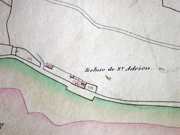 Cette maison d'éclusier abritait un logement d'ingénieur construit après la mise en service du canal en 1827. Elle est mentionnée sur le cadastre ancien de 1829 sous le numéro de parcelle 837. Le logis était prolongé au nord par une écurie, probablement allongée à la fin du 19e siècle et désormais détruite. Une petite dépendance est édifiée au sud. L'usine électrique construite en 1933 (date portée) de l'autre côté de la berge du Blavet utilise l'énergie hydraulique générée par la chute d'eau. Une inscription est peinte sur la façade : "Electricité de France/Usine de Saint-Adrien n°16". L'écluse est postérieure à 1829 car seul le terre plein est figuré sur le cadastre ancien.