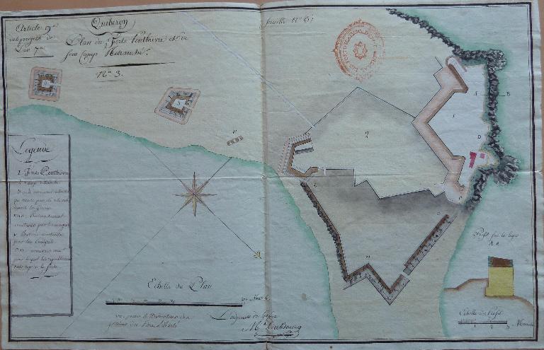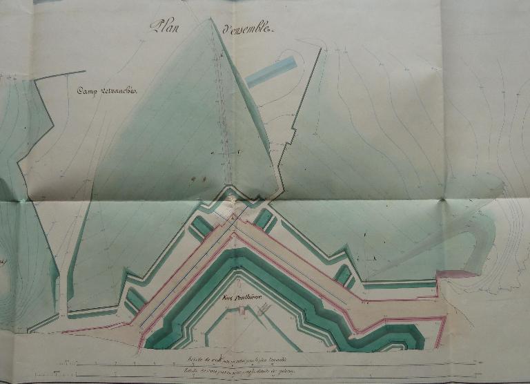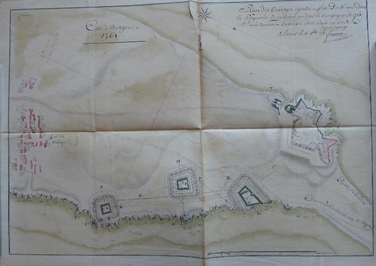 D'après la note ci-dessous [...] on voit que les travaux du Fort Penthièvre, commencés en 1747, furent suspendus au milieu de l'exercice 1748. A diverses époques subséquentes, des modifications et de nouveau projets furent adressés, pour occuper convenablement la hauteur de la Palisse, mais ils ne furent point exécutés.