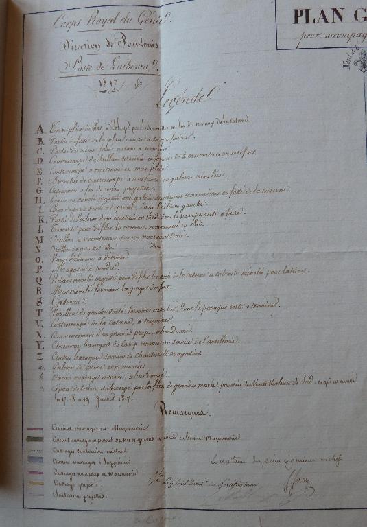 Il n'y a de caserne que la caserne défensive, pas d'écuries ni d'hôpital ; il y a deux manutentions, une en bon état dans la caserne, une autre en ruine dans le camp. Il n'y a pas de magasins généraux.