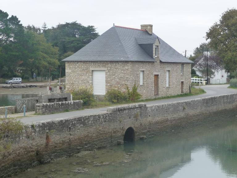 La façade aval n'est pas visible sur les plans disponibles. Aujourd'hui elle présente deux fenêtres de part et d'autre d'une troisième dont les dimensions évoquent une ancienne porte haute donnant au dessus de la mer, configuration que l'on retrouve aussi au moulin de Pen Castel. Cette ouverture caractéristique des moulins à marée permettait de décharger ou charger des navires en sacs de grains ou de farine à l'aide d'une poulie.